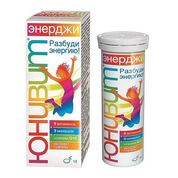 ЮНИВИТ® Энерджи – биологически активная добавка к пище – дополнительный источник витаминов С, группы В (В1, В2, В6, В12, фолиевой кислоты, кальция пантотената, ниацина, биотина), минеральных элементов (магния, железа, цинка), источник коэнзима Q10. Содержит кофеин.