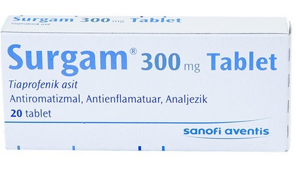 В одной таблетке препарата Сургам содержится 300 мг тиапрофеновой кислоты.