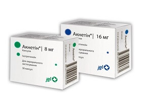 В 1 капсуле 8 мг или 16 мг изотретиноина.
