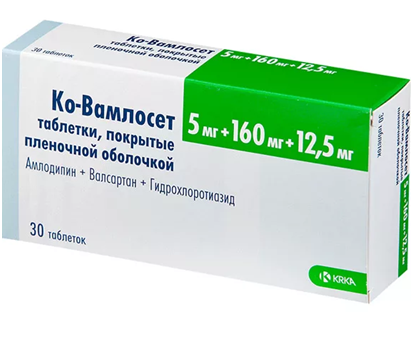 Препарат Ко-Вамлосет является комбинацией трех гипотензивных компонентов с дополняющим друг друга механизмом контроля артериального давления (АД): амлодипина (производное дигидропиридина) – БМКК, валсартана – АРА II и гидрохлоротиазида (ГХТЗ) – тиазидного диуретика. Комбинация этих компонентов приводит к более выраженному снижению АД по сравнению с таковым на фоне монотерапии каждым препаратом в отдельности.