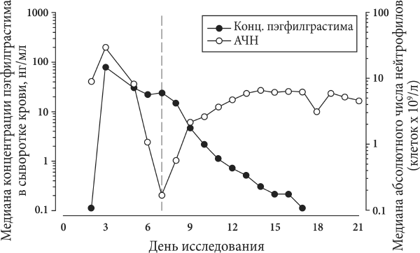 Графики изменения медианы концентрации пэгфилграстима в сыворотке крови и медианы абсолютного числа нейтрофилов (АЧН) во времени после однократной инъекции 6 мг пэгфилграстима пациентам, получающим химиотерапию.