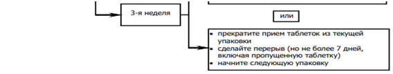 После 7-дневного перерыва начинать прием таблеток из новой упаковки необходимо даже в случае, если менструальноподобное кровотечение еще не прекратилось. Это означает, что начинать прием таблеток из новой упаковки необходимо в один и тот же день недели, и что каждый месяц кровотечение «отмены» будет наступать примерно в один и тот же день недели.