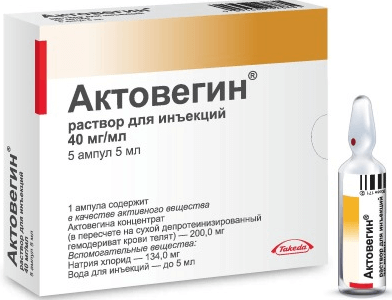 вспомогательное вещество: вода для инъекций – до 5 мл. Для ампул объемом 10 мл: 1 ампула содержит: действующее вещество: Актовегин концентрат (в пересчете на сухой депротеинизированный гемодериват крови телят)1) – 400,0 мг;