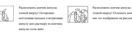 Осторожно постукивая пальцем и встряхивая ампулу дать раствору из кончика ампулы стечь вниз. Расположить кончик ампулы точкой кверху! Отломать кончик, как это изображено на рисунке.